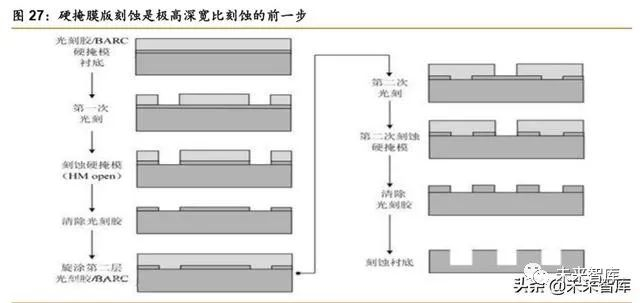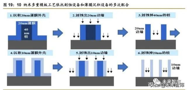 刻蚀与薄膜沉积结合:多重掩膜技术推动先进工艺发展。随着集成电路芯片制造工艺的 进步,线宽不断缩小、芯片结构 3D 化,晶圆制造向 7 纳米、5 纳米以及更先进的工艺发展。由于普遍使用的浸没式光刻机受到波长限制,14 纳米及以下的逻辑器件微观结构的加工将通 过等离子体刻蚀和薄膜沉积的工艺组合——多重模板效应来实现,使得相关设备的加工步骤 增多。刻蚀设备和薄膜沉积设备有望正成为更关键且投资占比最高的设备。
