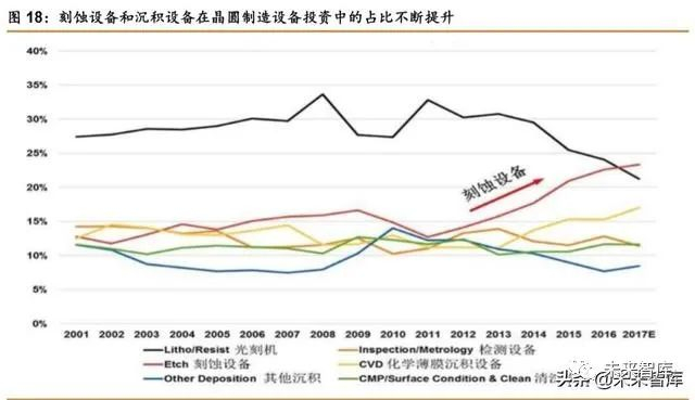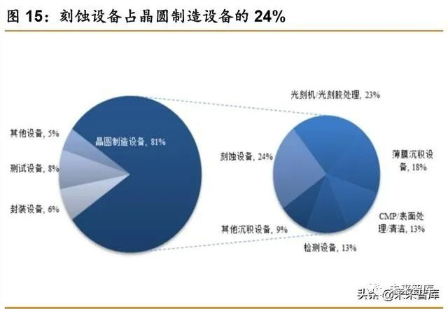 刻蚀承接光刻,设备投资占晶圆制造设备的 24%。光刻是用照相复印的方法,将掩模版 上的图形精确地复印到涂在硅片表面的光刻胶或其他掩蔽膜上面,然后在光刻胶或其他掩蔽 膜的保护下对硅片进行刻蚀。而所谓刻蚀就是将光刻产生的光刻胶图形,包括线、面和孔洞, 准确无误地转印到光刻胶底下的材质上,以形成集成电路的复杂结构。