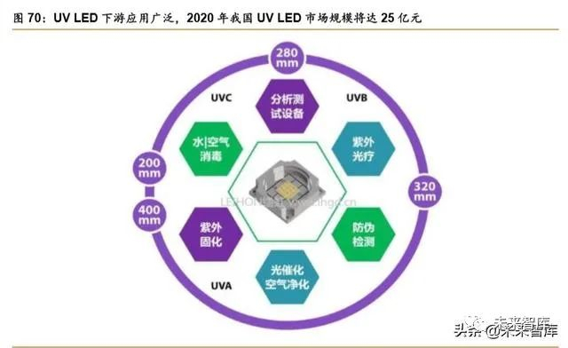 UV LED 应用广泛,难点在于薄膜沉积技术突破。UV LED 是指利用半导体发光原理来 制造 UV 波段的光源,用于消毒、医学、检测、固化等领域的一种新型 LED 技术,具有可靠 度高、无需加热、无有毒物质汞、寿命长、能量转换损失少等优点。据 GGII 预计 2020 年全 球 UV LED 市场规模将达 35.5 亿元,据智研咨询测算,2020 年我国 UVLED 市场规模将达 25 亿元。但目前 UV LED 价格相对昂贵,主要原因是在薄膜沉积过程中会遇到发光层以外 的各层材料光吸收问题以及相对于传统蓝光与绿光的压缩应力,UV LED 升高的伸张应力会 使得外延难度上升非常多,这就需要更高温度的 MOCVD 系统设计。