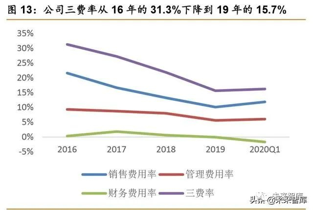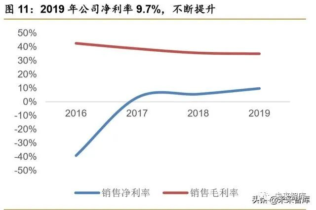 费用管控良好,19 年公司净利率 9.7%,同比+4.2pp,人均产值 269.3 万元。随着营收 规模的持续上升,公司销售费用率和管理费用率逐年降低。2019 年公司销售/管理/财务费用 率分别为 10.1%/5.6%/-0.1%,分别同比-3.1pp/-2.4pp/-0.7pp。公司三费率从 2016 年的 31.3% 下降到 2019 年的 15.7%。在良好的费用管控能力推动下,公司净利率稳步提升,2019 年公 司净利率为 9.7%,同比+4.2pp,2019 年公司人均产值为 269.3 万元,人均产值不断提升。