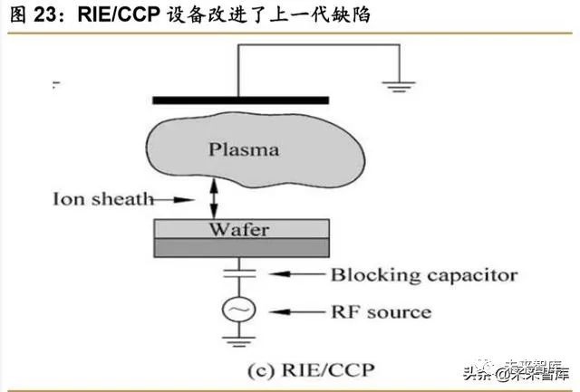 第二代:RIE/CCP 和 ME-RIE/CCP——等离子体密度增大,精确度提升。RIE/CCP 可 以产生中等密度等离子体,采用直流自偏置电压可控制离子能量,相比第一代等离子刻蚀机 可以以更低气压确保更小尺寸图形转移的精确度。ME-RIE/CCP 则是通过外加磁场的方式, 使等离子电离度更高,密度更大。但采用电容耦合形成的等离子体单个能量较高,对材料表 面物理伤害大。