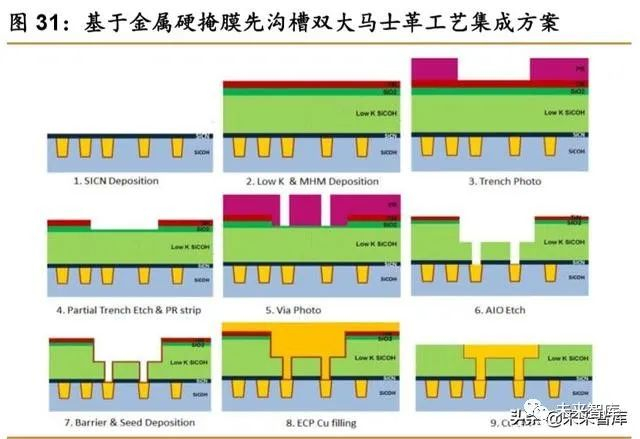 大马士革工艺具体步骤:各向异性刻蚀来刻蚀层间电介质层(刻出通孔图案)→沉积一 层薄的阻挡金属膜(例如 Ti、Ta、TaN、TiN 等),电镀 Cu 层(填满整个氧化硅凹槽)→化 学机械抛光(CMP)去除多余的 Cu→沉积一层刻蚀停止层(SiC、氮化物)和电介质层(氧 化物)→各项异性刻蚀来刻蚀层间电介质层(刻蚀互连金属层),电镀 Cu→CMP 抛光多余 的 Cu。