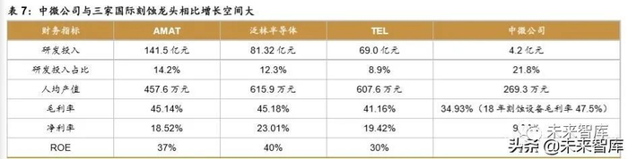 高性价比产品实现 19 逆势增长,技术相同情况下,公司规模将加速赶上。在 2019 年 半导体周期下行的情况下,中微公司实现逆势增长,营业收入为 19.5 亿元,同比+18.8%, 归母净利润 1.9 亿元,同比+107.5%,反映出公司产品的高性价比使公司穿越周期。通过对 比三家刻蚀设备国际龙头与公司的财务数据,我们发现公司作为新兴的设备公司,与国际巨 头的差距主要体现在规模上。公司研发费用投入占比为 21.8%,高于竞争对手,虽然规模有 一定差距,但在大基金及社会融资支持下,公司后劲十足。考虑到公司近两年 MOCVD 设备 采取“以价换量”战略,拉低了公司整体毛利率,若近看刻蚀设备单项毛利率,公司 2018 年刻蚀设备毛利率为 47.5%,在竞争对手中处于领先地位。目前公司的 MOCVD 技术和刻蚀 技术均已处于国际先进水平,预计在国产替代大背景下及公司自主创新能力不断增强,公司 未来各项规模指标将迎头赶上。