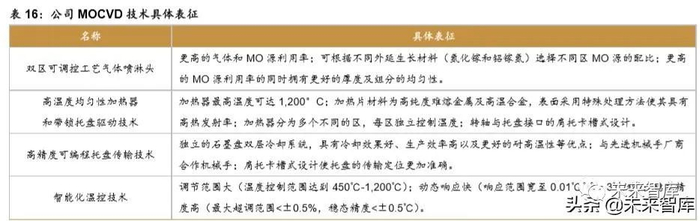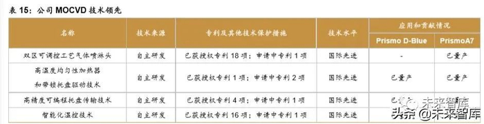 公司 MOCVD 技术领先,已成为全球氮化钾基 LED MOCVD 龙头。公司的 MOCVD 设 备 Prismo D-Blue、Prismo A7 能分别实现单腔 14 片 4 英寸和单腔 34 片 4 英寸外延片加工 能力,包含多项国际先进技术,其中 Prismo A7 设备已在全球氮化镓基 LED MOCVD 市场 中占据领先地位,公司 18 年占全球氮化钾基 LED MOCVD 市场的 60%以上,已成为全球氮 化钾基 LED MOCVD 龙头。