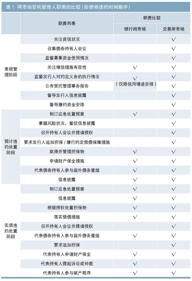 在交易所市场,原则上主承销商的职责仅限于上市和发行,后续管理主要由受托管理人负责。因此,受托管理人从发行完成后,即开始代表投资者利益履行后续管理职责。而银行间市场的受托管理人不同,其职责更聚焦于违约及风险处置阶段的相关工作,基本不涉及存续期的常规监测和督导(见表1)。