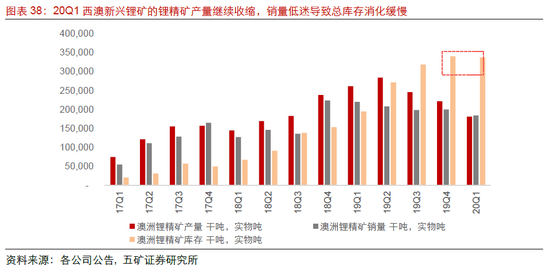 2020年一季度,除Talison之外,西澳在产新兴澳矿(Mt Cattlin、Mt Marion、Pilbara、Altura)总共实现锂精矿产量约18.1万吨,同比缩减31%、环比缩减18%,实现锂精矿总销量约18.4万吨,同比缩减16%、环比缩减8%,总库存量终于开始边际下行。