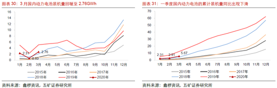 三月装机量环比增长,但一季度数据总体惨淡。根据鑫椤资讯,3月动力电池装机量2.76GWh,同比下滑46%,环比增长363%,环比提升主要系疫情得到控制、开工率提高。2020年一季度累计装机量约5.67GWh,同比下滑达54%。