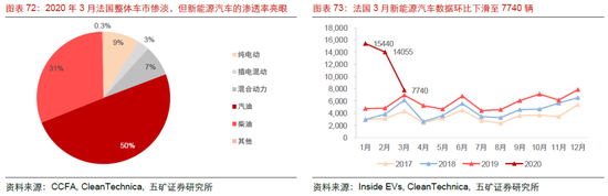 法国新能源汽车市场:3月法国汽车市场整体同比下滑72%,主要系疫情下法国采取了封锁措施,自3月17日封锁生效后,仅有305辆汽车交付给私人买家。但在新能源汽车方面,依然实现了7740辆的注册量,同比增长12%,环比下滑45%。其中,新能源乘用车的注册量为7318辆,渗透率达到月度新高的11.7%,其中纯电动乘用车注册5510辆,插电混动注册1808辆,纯电动的占比高达75.3%。