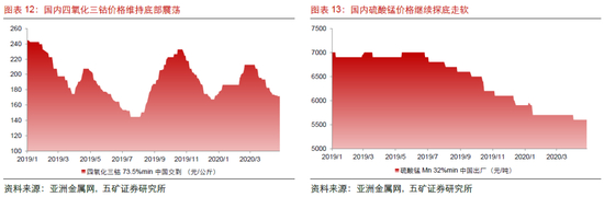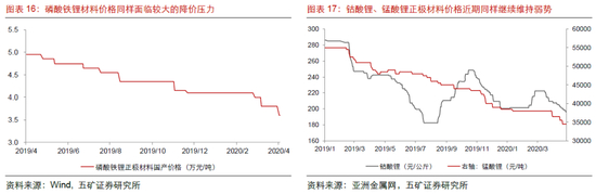 锰酸锂:至4月底,锰酸锂均价3.45万元/吨,同比下跌29%,逼近生产成本线,后续价格下探空间有限。