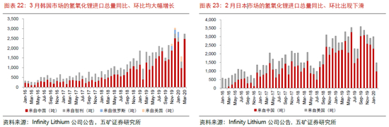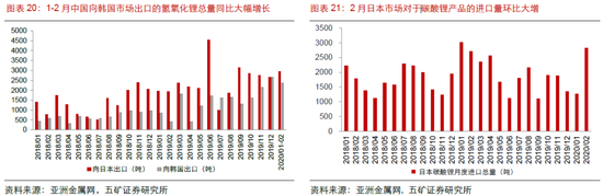 关注结构差异,1-2月氢氧化锂的需求增长主要在韩国市场,而非日本市场。2020年1-2月,中国向日本出口氢氧化锂2950.7吨,同比下滑24%,但中国向韩国出口氢氧化锂2357.6吨,同比大幅增长87%。同时据海外市场的进口口径,2020年2月份,日本进口氢氧化锂总量约1480吨,同比下滑44%,环比下滑51%;2月份韩国进口氢氧化锂约1570吨,同比增长66%,环比下滑44%,3月份韩国进口氢氧化锂约2720吨,同比增长51%,环比大增73.5%,且进口均价达到了14.4美元/千克。我们判断,日本市场阶段性放缓了氢氧化锂进口主因Tesla体系受到疫情和停工的制约,而韩国锂电厂商主要对口欧洲车企,该体系的动力电池供应更为紧俏,因此LG Chem等的备货和生产暂未遭遇显著影响。
