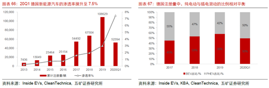 2020年一季度,德国新能源汽车的注册量总体实现52394辆,同比大幅增长125%,环比增长53%,渗透率走高至7.5%。分车型看,一季度纯电动注册量25975辆,插电混动注册量26419辆,二者的比例基本持平。