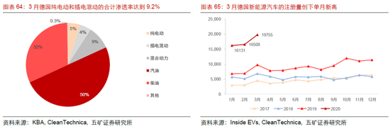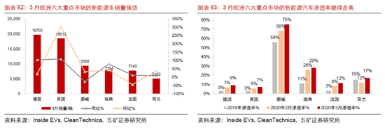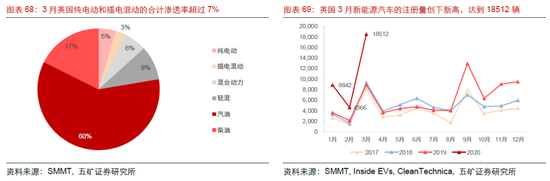德国新能源汽车市场:德国是欧洲最大的汽车市场,受疫情影响,3月整体车市销量同比大幅下滑38%,但与此同时,新能源乘用车的注册量(纯电+插电混动)却达到了月度历史新高的19755辆,同比增长约104%,环比增长约20%,渗透率也提升至9.2%。此外,德国市场3月纯电动与插电混动的注册量比例较为平衡,其中纯电动车注册量10329辆,同比增长56%,插电混动注册量9426辆,同比增长208%。
