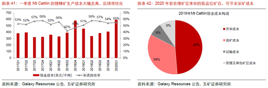 经营效能方面:(1)一季度Altura的选矿回收率录得60%,环比小幅走低。(2)20Q1重选粗颗粒锂精矿和浮选细颗粒锂精矿的产出比例为1.33,一季度公司完成了对于浮选产线升级的初步研究,未来落地后有望通过新增磨矿能力来提高浮选的回收率。(3)矿山的现金生产成本在20Q1继续优化至345美元/湿吨(FOB),若考虑水含量、原住民地权和海运费用,我们测算其折算约对应425美元/干吨(CIF)。(4)向前看,伴随选矿技改方面的推进,公司的短期成本目标为降至300美元/湿吨(FOB)之下。