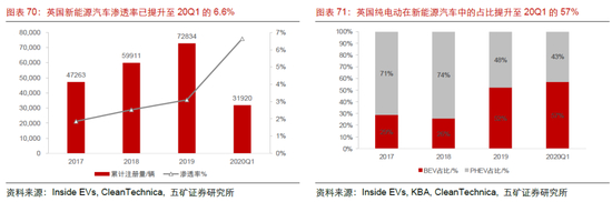 2020年一季度,英国汽车的总计注册量为483,557辆,同比下滑31%,同期新能源汽车实现大幅增长。其中,纯电动总计注册18256辆,同比增长204%,插电混动13662辆,同比增长59%。新能源车的渗透率达到6.6%,较2019年度走高3.5个百分点。分车型看,纯电动的占比也从2019年的52.2%提升至2020Q1的57.2%。