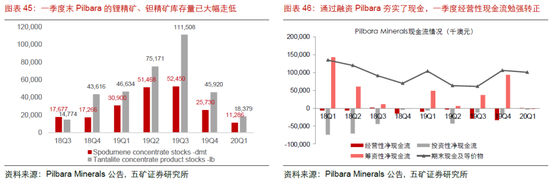一季度经营性净现金流勉强转正,在手现金暂时充足。20Q1公司实现销售收入2700万澳元,经营性净现金流122.5万澳元(上一季度为-3286.4万澳元),近五个季度以来首次转正,但需注意这是在20Q1显著降低采矿量、削减锂精矿产量、并积极扩大销量的情形下才实现的。截止2019年3月底,公司在手现金小幅升至1.08亿澳元,短期足以偿还美元抵押债券(本金1亿美元,12%年息率)以及流动资金借款的利息。