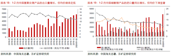 2020年1-2月中国的氢氧化锂出口量逆市实现增长。2020年1-2月中国氢氧化锂出口总量5679.6吨,同比增长约5%,进口量几乎为零。虽然春节假期、疫情对于开工率造成压制,但出口量的逆市增长反映出日韩锂电厂商的开工较高、欧洲终端市场的电动化趋势确定。1-2月中国氢氧化锂出口均价11.2美元/千克,同比下跌20.5%,环比下跌5.2%。