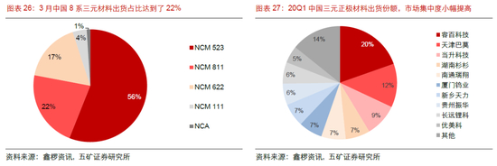 一季度正极材料市场回溯:(1)根据鑫椤资讯统计,20Q1中国三元正极材料产量25,470吨,同比显著下滑45%;三元前驱体产量46,210吨,同比下滑27%;磷酸铁锂材料产量15,880吨,同比下滑21%;钴酸锂产量约11,720吨,同比依然实现10%的增长;锰酸锂产量13,190吨,同比下滑17%。一季度钴酸锂产量实现了逆势增长,预计主要受益于5G手机产业链的备货拉动。(2)关于三元材料的结构,3月份高镍8系的出货量占比升至22%,6系三元的占比降至17%,5系三元的占比依然达到56%,中国市场整体依然处于高镍三元的导入阶段。(3)竞争格局方面,钴酸锂市场已经完成了头部集中化,铁锂材料的供应格局也愈发清晰,但三元材料的竞争依然胶着。2017年来,深度协同CATL的正极材料厂商的份额获得了充分保障,但在高镍导入期势必将面临新一轮的产能竞争和成本拼杀,同时铁锂路径的返潮也将加剧未来三元材料市场的竞争。