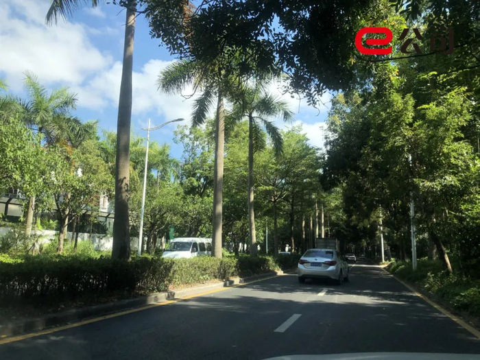 不得不说,这个低密度豪宅片区绿化非常好,不宽的道路两旁树木成荫,过往车辆不多,行人很少,环境幽静,路边时有地产中介人员举牌周边二手高端房笋盘信息。
