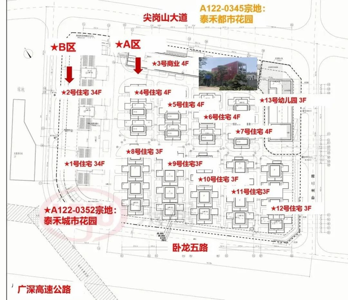 泰禾深圳院子,被定位为以低密度住宅为主的高端生态豪宅区,总面积达230.25公顷,其中54万㎡纯别墅区,地块北高南低。据规划国土局的公示,目前在建的一期项目是A122-0352地块(尖岗山大道以南),备案名为泰禾城市花园(推广名:泰禾深圳院子)分为A/B两区。A区计容积率建筑面积2.1万平方米,为11栋主体(含9栋别墅、1栋幼儿园、1栋商业),建筑高度20.7米,为地上3/4层,地下3层结构。B区计容积率建筑面积3.9万平方米,为2栋主体,建筑高度110.85米34层。AB两区共规划停车位550个,配建商业和一所6班幼儿园,其他配套物业服务用房、架空绿化、消防空间等共计约2500平方米。
