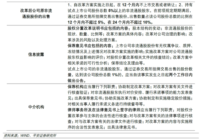 从股权分置改革的经验来看,第一,我国资本市场改革都是经历从增量改革到存量改革的过程,以点带面步步推进;第二,市场力量在改革过程中愈发重要,市场沟通的重要性被充分重视,市场化定价有挑战;第三,改革加大了对国有企业的市场化约束,对企业盈利及治理提出了更高要求。