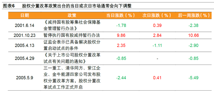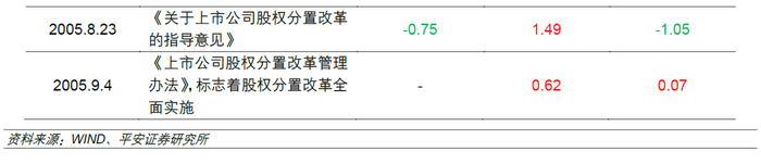 但是市场担忧于股权分置改革带来的不确定性而延续下行。一方面,投资者对2001年国有股减持带来的负面影响记忆犹新,对新一轮改革带来的不确定性较为担忧。另一方面,改革之后非流通股从根本上已具备与流通股相同的流动性,若剔除流动性溢价的影响,彼时的股价和市盈率明显偏高。与此同时,持续上升的无风险收益率也对股市形成打击。2004年2月国九条出台后,上证综指从4月高点1778震荡下行,期间虽陆续出台降低印花税、保险资金入市等政策,但是对市场的支撑作用有限,上证综指持续下行至2005年6的998点,期间调整幅度达到43.9%;指数市盈率从2004年2月的37.2倍左右下降至2005年6月的17.7倍。可以看到,在股权分置改革相关政策发布的当天或次日,市场基本都出现了不同程度的调整。