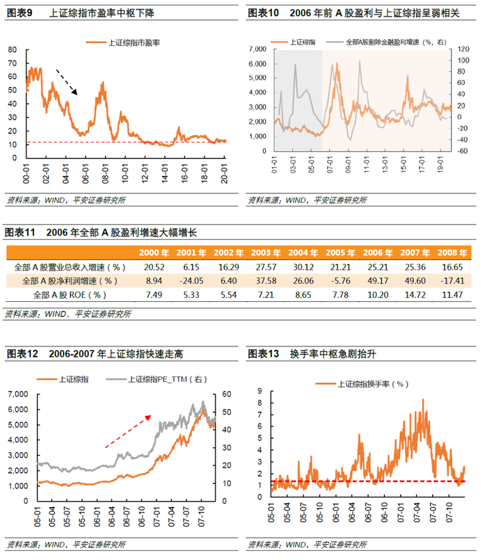 全面实施(2005/09-2006/12):在自主协商原则的引导下,试点公司改革预案获得市场认可,送股对价为主要方案。2005年9月改革全面推开,不确定性落地后市场情绪企稳回升,市盈率中枢从2000年的60倍下降至2005年底的20倍左右,06年全A盈利增速提升至49.2%,叠加货币政策宽松加码,上证综指于2007年10月创历史新高,期间累计涨幅达4倍。