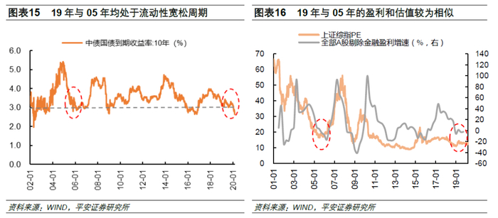 第二,两者所处阶段的流动性环境、盈利基本面以及估值区位较为相近。流动性方面,2019年与2005年均处于无风险利率下行阶段,2019年末与2015年末的十年期国债收益率均为3.12%-3.14%左右,截止2020年5月6日,十年期国债收益率为2.58%,处于历史底位;盈利方面,2018年底和2005年底全部A股(非金融)净利润增速均处于盈利周期的底部区域;估值方面,2019年和2005年上证综指市盈率均处在10-20倍低位区间。