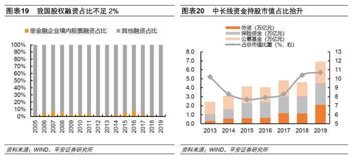 第三,本轮资本市场改革的范围更广,更注重制度之间的协同作用。优化并购重组本是资本市场的大势所趋,但是由于2015年的“股灾”部分归因于并购重组概念的炒作,因此2016-2018年间,监管对并购重组进行了全面收紧,资本市场优化整合的功能也未能得到有效发挥。本轮资本市场改革再度放宽了并购重组的各项限制,但是为了防止2015年“股灾”的重演,放宽的同时也对其余多项制度进行了调整和规范,旨在发挥制度间的协调作用,使并购重组焕发活力的同时又不至于陷入“投机圈钱”的尴尬境地,因此本轮资本市场涉及的制度范围更广,实施难度也更大。具体措施包括:第一,推行注册制。IPO常态化有助于降低壳资源的价值,一定程度上避免了对“上市资格稀缺性”的炒作。第二,引导投资者树立价值投资理念。包括加大对外开放力度和鼓励中长线资金入市,截止2019年末,QFII+陆股通持股市值占全部A股市场市值比重为2.3%,较2005年底上升2.0个百分点。第三,规范市场参与者的行为。包括加大退市力度、加强信息披露和提高违法违规成本。