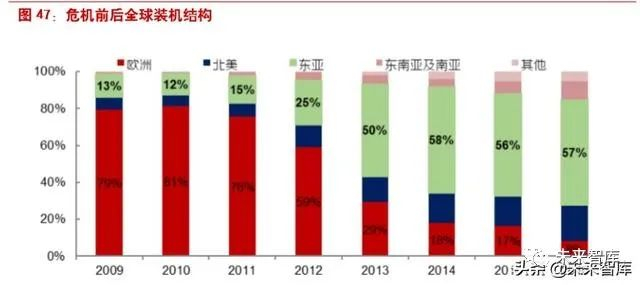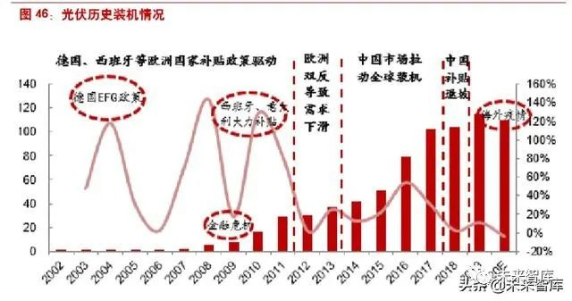 ➢ 2012 年危机是由外在中国政策补贴刺激带动恢复的。2011 年欧债危机,德国西班牙补贴大 幅下降;随后欧美推出双反,合计占比 80%以上的市场对中国关上了大门;当时光伏经济性 还较差,对补贴依赖性强,内生增长动力不足,因此市场在中国出台政策扶持后,日本韩国 也快速增长,2013 年东亚地区新增装机占比已提升至 50%以上,国内取代欧美成为主要市 场;