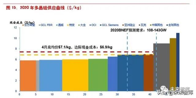 根据 BNEF 统计,从 2020 年多晶硅总供应曲线来看,边际厂商现金成本接近,价格对需求敏感度 较低。年化来看,截止 2020 年 4 月底,按 80%单晶料占比测算的国内硅料平均成交价为$7.1/kg (不含税),按年化需求对应的价格仍有小幅下降空间;但综合考虑到需求侧七八月份国内抢装完毕以及海外夏休出现的真空期,以及供给侧五月份五家万吨级企业检修(环比产量减少约 12%), 预计短期价格在底部震荡。
