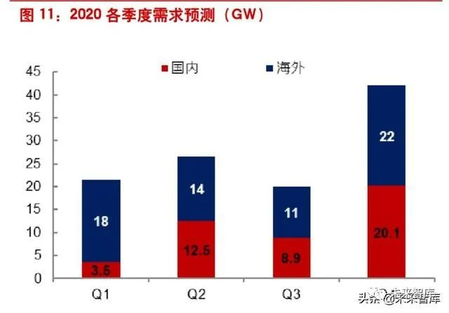 3)分季度来看,六七月份或为至暗时刻。一季度,根据能源局数据,国内装机为 3.48GW,海关 数据显示国内组件出口为 14.77GW,考虑部分东南亚组件产能,预计海外需求为 18GW,合计 21.5GW;二季度,国内主要来自 2019 年竞价结转项目抢 630,户用和配套项目也逐步落地,海 外二季度是首个疫情影响的完整季度,但需求多数在去年 Q4 确定,预计合计 26.5GW;三季度, 尤其是七月份前后,国内预计仅有户用项目景气较高,海外夏休惯例,且存量订单基本结束,预计 19.9GW;四季度,国内来自部分新竞价项目、平价结转等,海外疫情好转,市场活力提高,预计 合计 42.1GW。