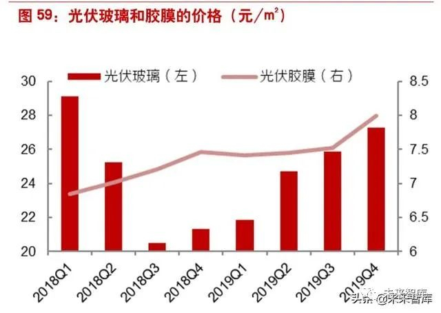 辅材方面,光伏玻璃生产特点类似于多晶硅,产能弹性较弱,一旦停产后复产动力较小。当光伏玻 璃价格从 2018 年 1 月的 29.5 元/m2 降至 2019 年 9 月的 20 元/m2;行业产线数量也从 137 条下 降至 126 条,2018Q4 需求恢复后价格快速反弹,全年反弹幅度超过 40%。光伏胶膜虽然价格也 有所上升,主要原因为原料 EVA 胶膜的涨价,毛利率基本稳定。
