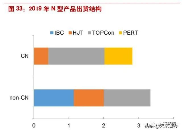 效率 23.5%+平台上,N 型电池或将成为主力。N 型路线主要分为异质结(HJT)、重掺杂多晶硅 钝化(TOPCon)、交指式背接触(IBC)和钝化发射极背面全扩散(PERT)。IBC 由于步骤过于 复杂,成本难以下降,以及 PERT 由于效率潜力有限,相比 PERC 并无明显优势,目前两者已基 本退出 N 型主流路线的竞争。而 TOPCon 和 HJT 目前量产的效率均在 23.5-24%+,实验室效率 可达 26%+,是高效路线的代表。从 2019 年中国和海外 N 型产品出货结构来看,TOPCon 和 HJT 的应用范围也更广。
