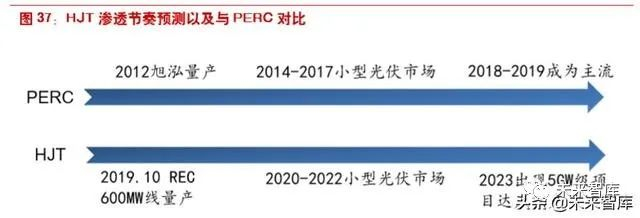 HJT 是最有希望接棒 PERC 的下一代技术,目前仍需解决设备国产化、耗材降低和效率提升三大 问题。HJT 电池理论效率高,生产步骤少,全程低温的特点被视为天花板很高、具备颠覆力的下一 代电池技术。根据我们的测算,目前 HJT 电池的成本约为 1.22 元/W,相比 PERC 高 0.57 元/W, 只能应用于一些追求效率不计成本的小众市场。