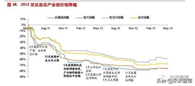 因双反拉锯战持续发酵。进入 10 月,美国七家光伏电池生产商联名提出申诉,要求对中国输美太 阳能电池征收高额惩罚性关税。同年 11 月,美国商务部正式立案。受此影响,Q4 产业链价格再 次全线下跌,降幅在 15%-35%不等。12 月底,美国推迟双反调查结果,产业链预计双反只是“表 面文章”,行业需求预期迅速转好,产业链价格再次企稳。随后美国正式公布双反税率,以及 2012H2 欧盟的跟进,2011 年合计占比 80%的欧美市场对中国产品关上了大门,产业链价格继续下跌。