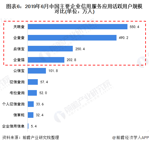 从企业信用信息服务领域来看,2014年是我国企业信息查询平台的发展元年。用户对企业信息以及商业类大数据查询需求的增大,让企业信息查询平台迅速崛起,天眼查、企查查、启信宝均在当年成立。随后,不断有玩家进入,易企查、企查猫等平台相继成立。2019年6月,天眼查、企查查、启信宝、企查猫4家机构活跃用户规模突破200万,处于行业第一梯队。市场竞争激烈,呈现白热化态势。