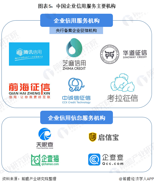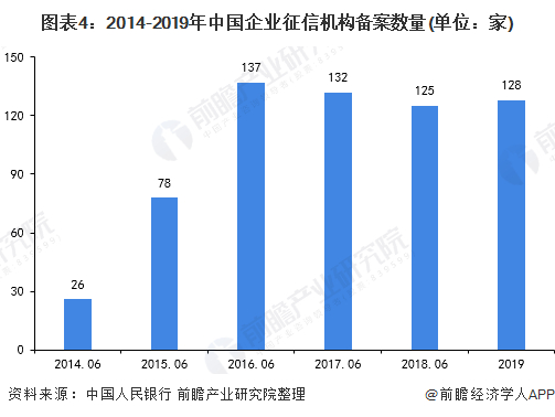 信用服务机构是社会信用体系建设的重要主体,近几年随着社会信用体系建设全面推进,大众和企业对于征信信息也愈发重视,企业信用服务市场前景非常巨大。截至2019年12月末,全国共有22个省(市)的128家企业征信机构在人民银行分支行完成备案。主要征信机构有芝麻信用、华道征信、考拉征信等;而企业信用信息服务机构主要有天眼查、企查查、启信宝、企查猫等。