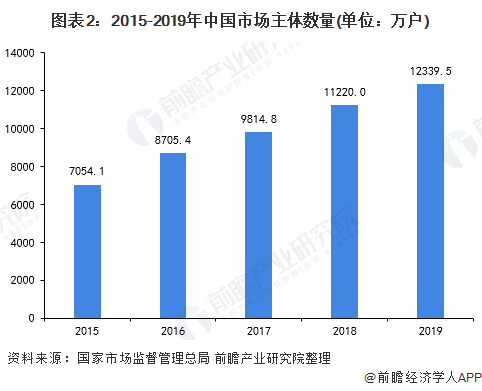 从基础性的企业信用服务来看,目前我国企业信用服务行业发展潜力巨大。随着商事制度改革的深入推进和创业创新效应的逐步显现,中国市场主体数量快速增长,新兴业态不断涌现。根据国家市场监督管理总局统计数据显示,2019年我国市场主体数量达到12339.5万户,比2018年增加了1119.5万户,不断增长的市场主体数量给企业信用服务带来了巨大的市场。