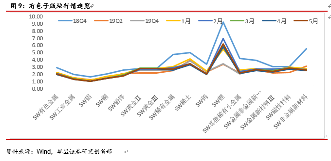 截止 2020 年5 月7 日,有色行业整体 PB 为2.05 倍,近 5 年行业平均 PB 为2.75 倍,中位数2.78 倍,当前PB 均低于历史平均值及中位数。分子版块看,黄金版块最新PB为2.8,近5年行业平均PB为2.79,基本持平。磁性材料版块PB为2.88,近5年行业平均PB为3.06,接近均值;稀有小金属子版块PB为2.76,近5年行业平均PB为4.75,当前PB处于历史低点。