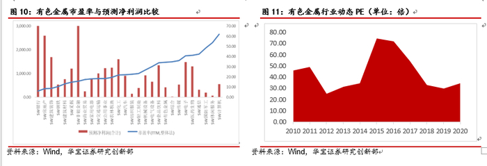 从板块横向对比看,有色金属板块市盈率(整体法)为35.0倍,高于各行业平均值26.1倍;有色板块2020年预测净利润(算数平均)约为6.8亿元,排在申万一级行业第21位(共29个一级行业),是2019年行业净利润(算术平均)1.29亿元的5.3倍。从历史估值方面看,截至2020年4月30日,有色金属行业滚动PE为35.0倍,远低于历史平均估值水平(44.1),相较于2019年底的39.0有所下滑。主要是由于:铜、铝价格暴跌导致相关公司市值大幅下滑;2019年底市场透支金价未来五个月的涨幅,导致2020年以来黄金行业整体估值有所回落;工业金属、稀有金属走势疲弱,市场悲观预期推迟估值修复。根据Wind统计数据,剔除负值后有色金属板块2019年底PE为39.0倍,截至2020年4月30日滚动PE 35.0倍,预测2020年PE为27.5倍。其中,工业金属板块2020年预测PE为20.1倍,贵金属板块2020年预测PE为30.7倍,稀有金属板块2019年预测PE为37.2倍,稀土及磁性材料预测PE为51.7倍。从细分板块来看,目前PE估值相对较高的板块是锂(529.4)、镍钴锡锑(60.9)及钨(42.4),均为稀有金属;PE估值相对较低的板块是铝(23.1)、铜(24.1)及铅锌(31.0),均为工业金属。