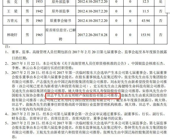 值得注意的是,田志平担任民生银行董事是由安邦财产保险股份有限公司推荐,在2018年7月3日,田志平和另一位民生银行董事即原安邦集团副总裁姚大锋一同因个人原因辞职。而在2017年2月20日至2018年7月3日之间,田志平担任民生银行董事的资格也未获得监管核准。