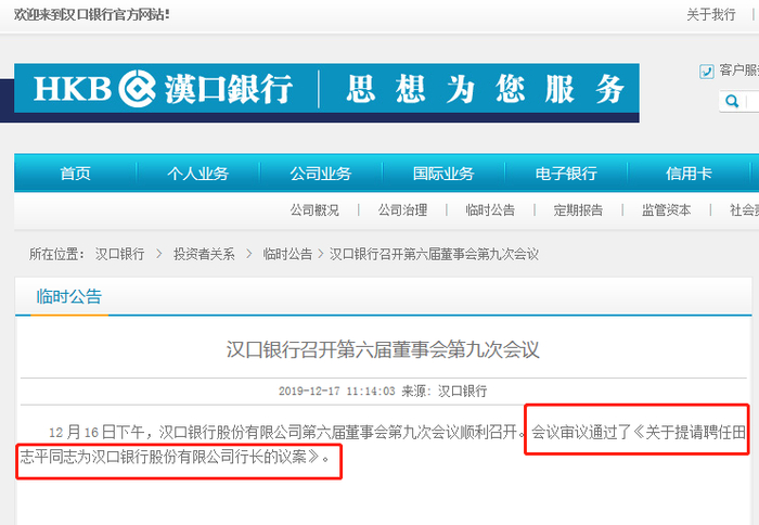 据汉口银行此前官网披露,2019年12月16日,汉口银行召开的第六届董事会第九次会议,审议通过了《关于提请聘任田志平同志为汉口银行股份有限公司行长的议案》。不过,汉口银行官网这条董事会会议的临时公告后续被删除。