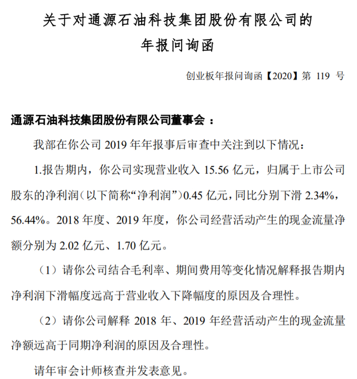 深交所要求解释净利润下滑幅度远高于营业收入下降幅度的原因及合理性,以及 2018 年、2019年经营活动产生的现金流量净额远高于同期净利润的原因及合理性。