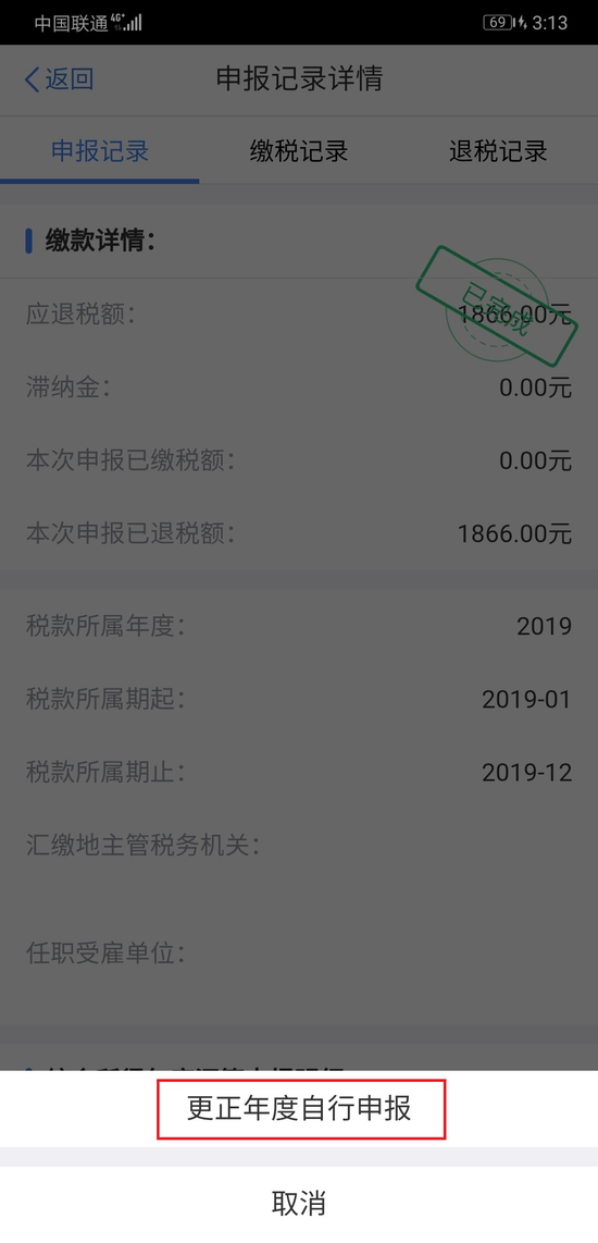 第四,申报记录详情页面中点击【更正】。