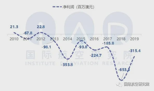 然而,维珍澳洲在转型为全服务航司后,并未完全打造好枢纽以对其国际航线提供有效支撑。转型前,维珍澳洲以低成本航空商业模式运营,而这一商业模式的航线网络结构多采用点对点模式,以期在短途航线上最大程度地提升飞机的使用率。为此,维珍在澳大利亚更多的机场分散投放运力,且其40余条国际航线的始发机场也较为分散,30%的国际航线从布里斯班始发,25%从悉尼出发,15%从墨尔本出发,剩余国际航线始发于其他城市。由于缺乏一个强有力的枢纽,维珍澳洲的国内航线很难形成合力为其国际航线输送客源。并且,尽管收购了虎航,但如前文所述,两家航司间的运营协调性远不如澳航和捷星,且虎航在各机场的份额也较小,因此澳洲虎航在为维珍澳洲的国际航线输送客源方面也不能提供太多贡献。总体而言,由于先天不足,维珍澳洲既缺少强大的国际航线网络,也未打造出一个成功的枢纽,国内航线网络对其国际航线无法形成有效支撑,因此,十年来,维珍澳洲的国际航线增长较为缓慢,且长期处于亏损状态。根据维珍澳洲的财报数据,其国际航线仅在2011、2012年盈利2240万与830万澳元,其他年份亏损金额均在2000万澳元以上,在2016年甚至亏损达2.5亿澳元,十年间累计亏损约5.9亿澳元。尽管国内航线多数是盈利状态,但国际航线的长期亏损,使公司的总收益受到极大影响,成为了维珍澳洲到今天地步的重要推动因素之一。