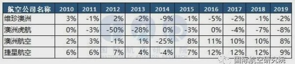 表:2010年至2019年四家航空公司运营利润率