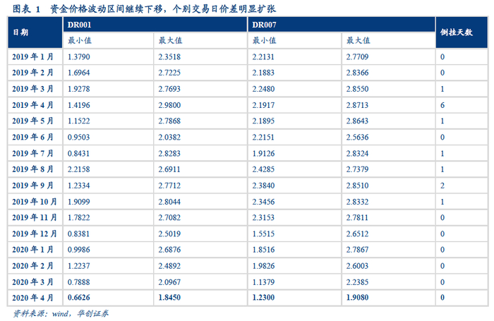 2020年4月,超储利率调降打开资金利率波动下限,流动性总量宽松,资金利率持续下行。波动区间方面,隔夜和7D资金波动区间再次下移,明显突破前期0.72%的下限限制,隔夜全天加权价格月末前最低达到0.66%,盘中最低价格在月中达到0.6%,7D全天加权价格月中最低达到1.23%,盘中最低价格达到0.7%,月中、税期和月末资金价格有小幅波动,隔夜全天加权在月末达到1.8%,7D全天加权在月末达到1.9%,均低于2%;价差方面,4月隔夜和7D资金价差有所压缩,个别交易日价差大幅扩张,月末之前一个交易日,资金需求以跨季为主,隔夜需求较少,供给充足,隔夜资金价格全天大幅回落,7D跨节资金需求旺盛,7D资金价格上行,两者背离,价差单日扩张至90BP以上。月末最后一个交易日,隔夜和7D资金均有所上行,价差缩小至10BP以下,但并未出现倒挂。