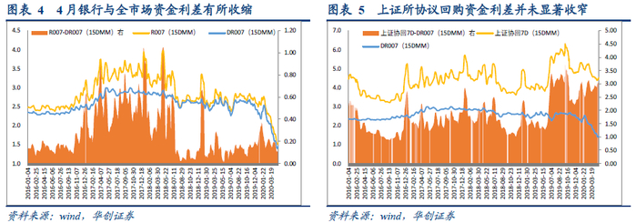 逆回购仍维持空窗期。4月全月未进行逆回购操作,始终维持空窗期;流动性总量宽松,足以吸收临时性流动性需求因素,且缴税截止日后延,税收收入的缩减和支出的增加,税期对资金面的扰动明显削弱,对逆回购投放短期流动性的需求相对较少。故全月未进行逆回购投放的情况下,资金面时点性波动并未显著加大。