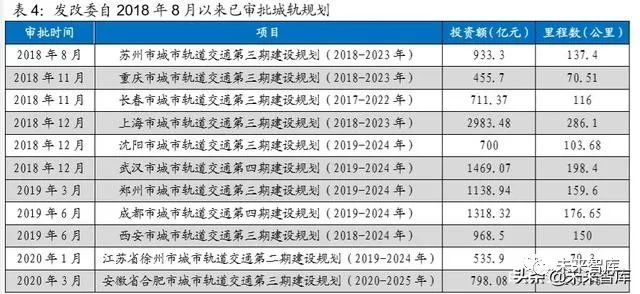 2018 年 7 月,国务院发布《国务院办公厅关于进一步加强城市轨道交通规划建 设管理的意见》,我国城轨审批正式重启,行业迎来发展拐点。发改委陆续批复 了苏州、重庆、长春等地的城轨规划;2018 年下半年审批城轨规划合计投资额 达 7253 亿元,里程数达 912 公里。2019 年获得审批的项目包括成都四期,郑 州三期,西安三期。进入 2020 年,受疫情影响下经济承压,新基建将成为重要 的稳增长手段。城轨作为新基建重点投入方向,建设规划批复呈现加快趋势。发 改委于 2020 年 1 月及 3 月先后批复徐州二期及合肥三期的城轨建设规划,总投 资额分别为 536 和 798 亿元。自 2018 年下半年审批重启以来,共批复 11 个城 轨建设规划,总投资额达 1.2 万亿元。城轨迎来黄金发展期,并将显著提升产业 链景气度。