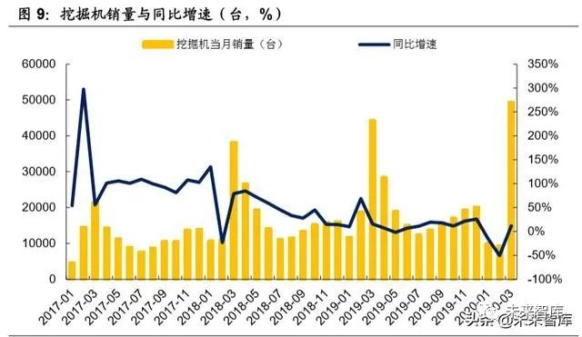 挖掘机迎曙光,3 月销量创新高。受春节假期和疫情影响,今年 1-2 月工程机械 销量承压。3 月以来国内重大铁路项目、能源项目、外资项目已经基本复工,前 期销量压力逐渐得到释放。3月共计销售挖掘机械产品4.9万台,同比增长11.6%。其中,国内市场销量 4.66 万台,同比增长 11.2%;出口销量 2798 台,同比增 长 17.7%。从吨位结构来看,小挖需求快速增长。3 月份小挖销量 3.16 万台, 同比增长 18.5%。疫情影响推迟工程机械旺季,随着复工进度持续推进,下游 需求稳步上升,修复产业链盈利能力,预计 4 月份销量保持高位。